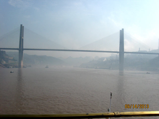Views from the ship are of bridges in the haze, a gorge, pagoda, buddha, stairway up the bank, a large industrial establishment. The unfoliaged area at the bottom shows the depth the water can take when controlled by the Three Gorges dam downstream. |